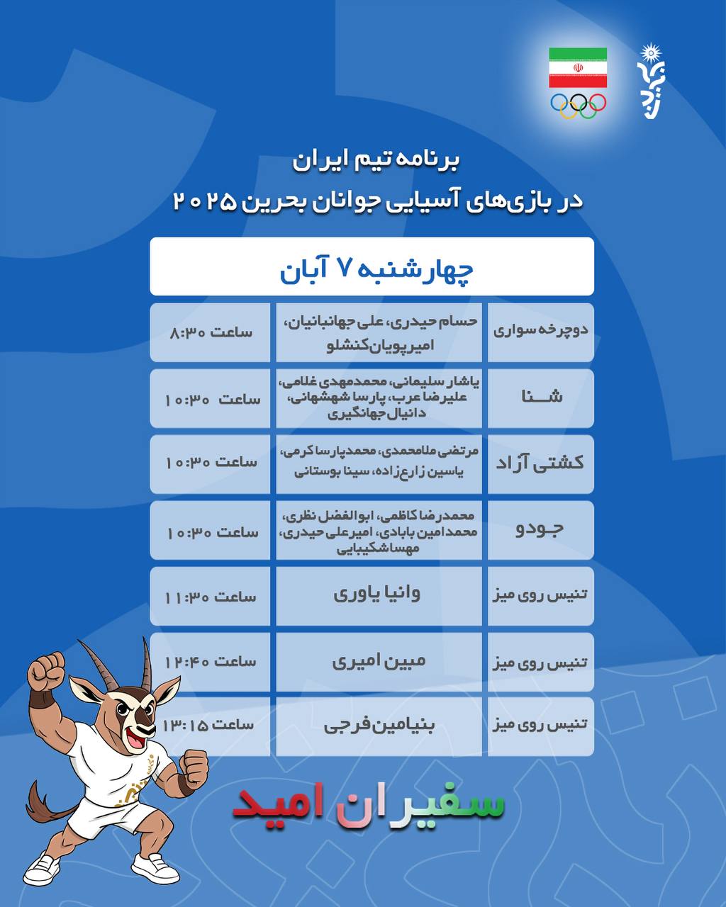 امروز (چهارشنبه ۷ آبانماه)، جودوکاران کشورمان در اوزان ۴۸-، ۵۰-، ۵۵-، ۶۰- و ۶۶- کیلوگرم از ساعت ۱۰:۳۰ به وقت ایران در سومین دوره مسابقات بازیهای آسیایی جوانان بحرین به روی تاتامی میروند.